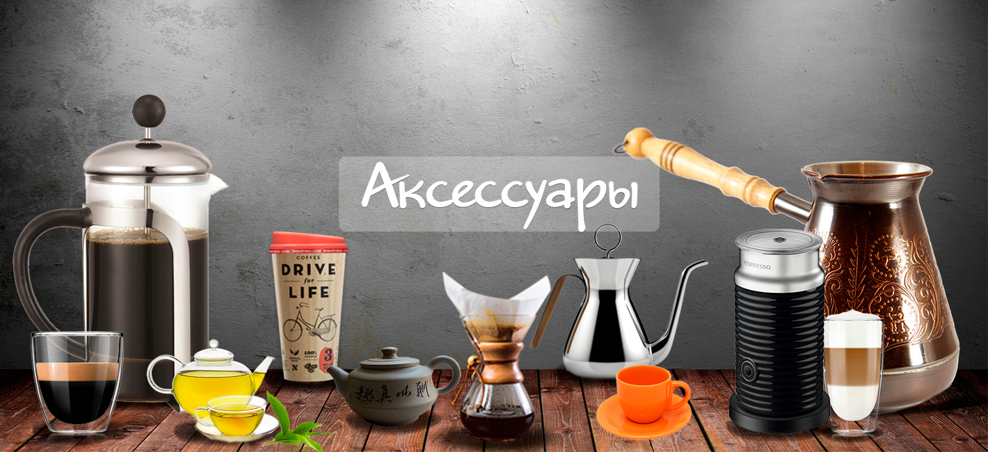 Огромный выбор аксессуаров - турки, френч-прессы, кемексы, гейзерные кофеварки, кофе-кружки, посуда и др., для приготовления кофе и чая.
